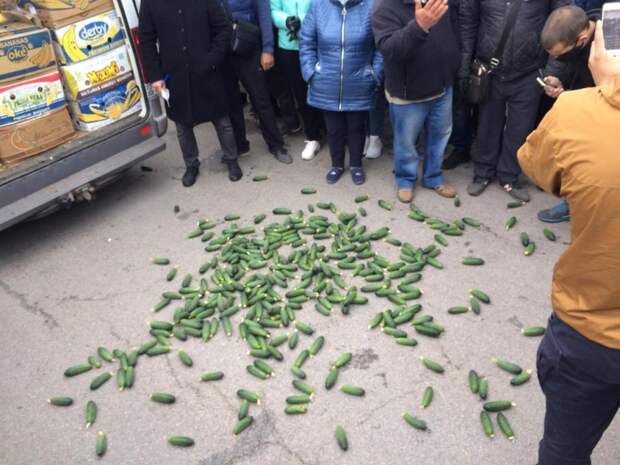 В доказательство один из протестующих выбросил на дорогу огурцы, объясняя это тем, что урожай негде продавать.