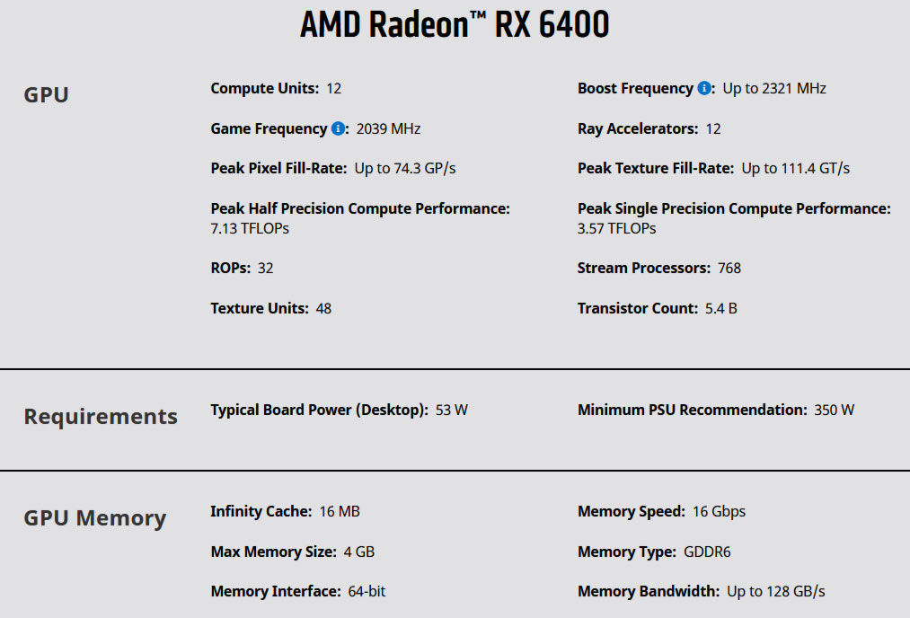По итогам четырёх тестов Radeon RX 6400 оказалась ожидаемо медленнее модели Radeon RX 6500 XT. В составе младшего ускорителя используются на 25 % меньше графических ядер, работающих на частоте почти на 500 МГц ниже, чем у Radeon RX 6500 XT (2815 МГц). Кроме того, заявленный показатель энергопотребления Radeon RX 6400 составляет всего 53 Вт. У старшей модели он равен 107 Вт.