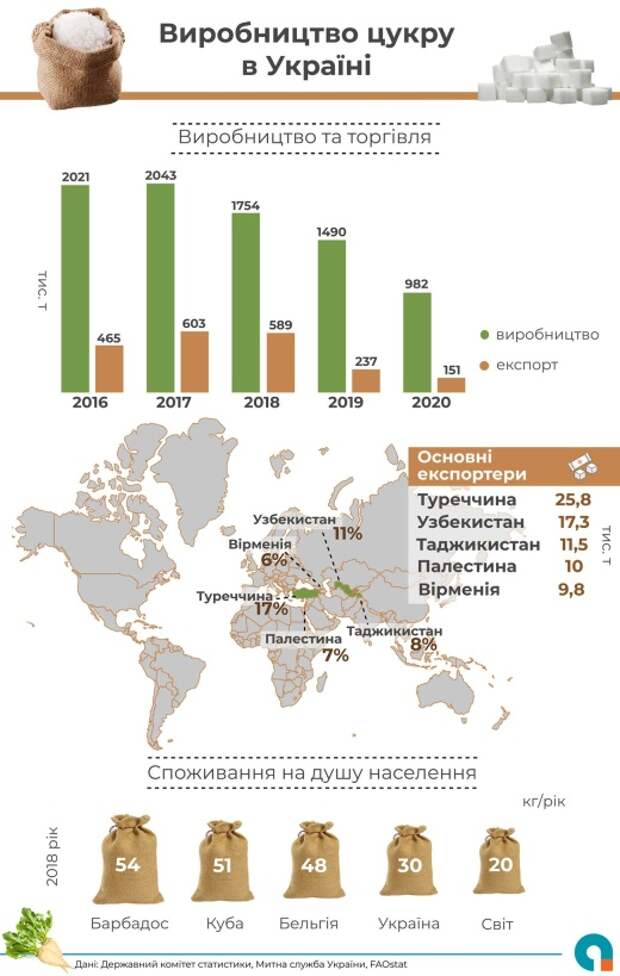 «Произведенный в Украине сахар идет на удовлетворение внутренних потребностей и на экспорт. Оба этих каналы реализации в последние годы сократились. За последние пять лет уровень потребления сахара на человека сократился на 19% и в 2019 году составил 28,8 килограмма в год. В 2020 году было экспортировано 151 тысяча тонн сахара, что на 36% меньше предыдущего года», — говорится в сообщении.