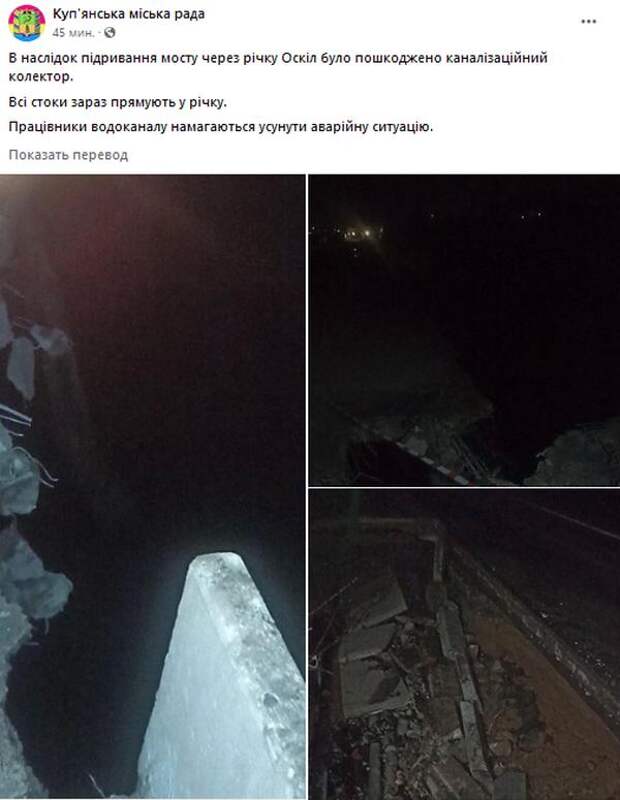 Согласно информации, украинские подразделения, покидая город подорвали мост через реку Оскол, в результате чего был поврежден канализационный коллектор. Все стоки сейчас направляются в реку. Работники водоканала пытаются устранить аварийную ситуацию.