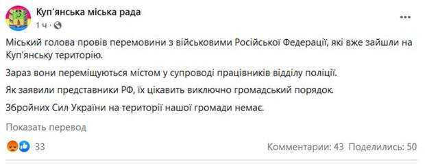 «Городской голова провел переговоры с военными Российской Федерации, которые уже зашли на Купянскую территорию. Сейчас они перемещаются по городу в сопровождении сотрудников отдела полиции. Как заявили представители РФ, их интересует исключительно общественный порядок. Вооруженных Сил Украины на территории нашей общины нет», — говорится в сообщении.