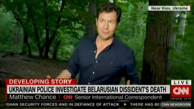 МЭТЬЮ ЧАНС, старший международный корреспондент CNN: Мы пришли сюда — в место в окрестностях Киева, столицы Украины, которое называется парком, но на самом деле оно скорее похоже на дремучий лес. Здесь обнаружили тело белорусского диссидента Виталия Шишова; его нашли повешенным вот на этом дереве буквально за пару часов до нашего приезда. Фактически мы прибыли прямо на место происшествия. И вот то самое дерево, на котором, как мы полагаем, его и обнаружила полиция ранним утром во вторник. Полиция сняла его с верёвки, однако его тело свисало прямо с этого сука, с высоты где-то 3,5 метра.