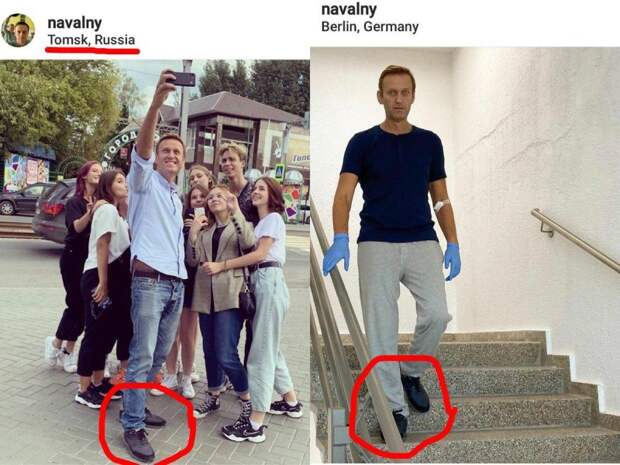 При том, что его пресс-секретарь ранее сообщала, что все вещи Навального забрала жена Алексея, сказав при этом, что вещи она отдаст только через свойКроме того, на одной из последних фотографий, сделанных в берлинской клинике, на блогере кроссовки, в которых он фотографировался в Томске еще до инцидента с отравлением.