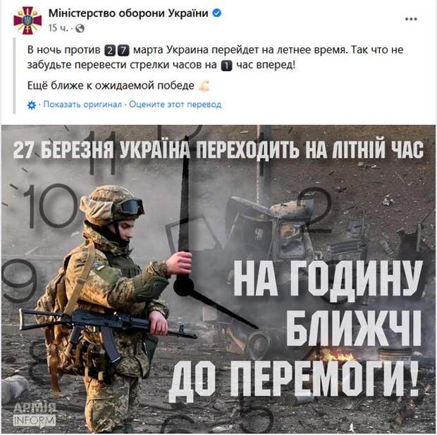 Представители Министерства обороны Украины надеются, что перевод времени на час приблизит победу.