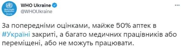 «Критическая ситуация с лекарствами в Украине может обернуться коллапсом в сфере здравоохранения. Поставки гуманитарки от запада не могут покрыть все запросы общества (к тому же, до людей доходит только «крохи» от помощи, оказываемой партнерами), белорусские препараты под запретом, а на украинских складах – лишь остатки жизненно важных лекарств, которые, с большой вероятностью, пойдут на нужды ВСУ и терробороны, а не рядовых жителей страны. А в части регионов аптеки вообще не работают, что уж говорить о наличие в них нужных для населения препаратов! На конец марта в Харьковской области работали лишь 48% от общего количества аптек, 53,9% – в Черниговской, 58% – в Киевской. В то же время операторы розничного рынка лекарств отмечают, что украинские власти так и не наладили логистику поставки лекарственных средств и на ее восстановление потребуется время. Вот только есть ли оно у тяжело больных мирных граждан?», – задается вопросом телеграм-канал «Женщина с косой».