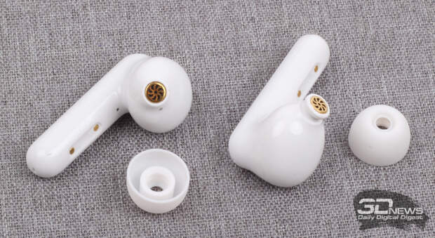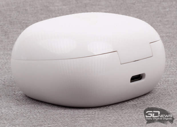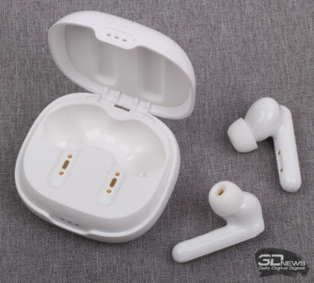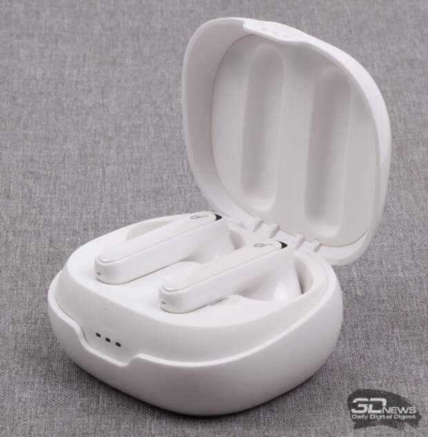 Новинка поставляется чёрном или белом цветах. Нам на тестирование достался второй вариант. Назвать решение скучным или безликим точно нельзя. Белоснежный пластик на наушниках и футляре дополнен вставками перламутрового и чёрного цветов, а также поверхностями с оригинальным рифлением.