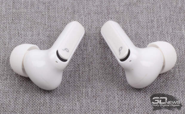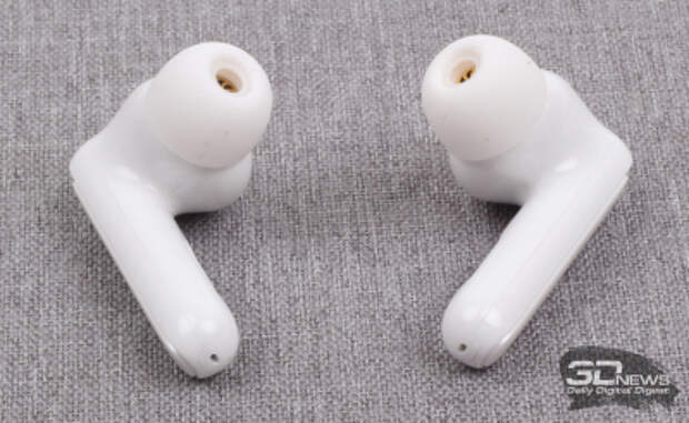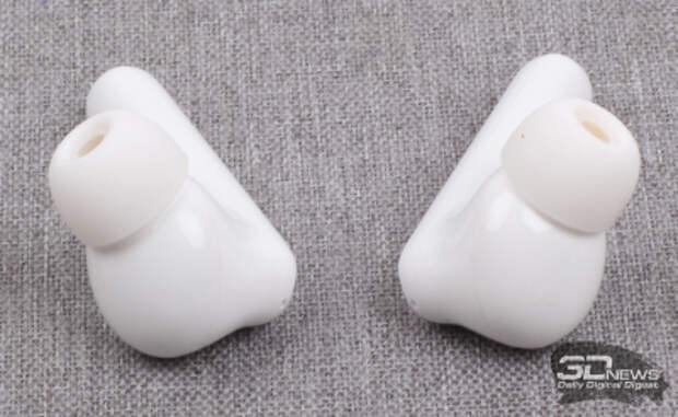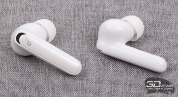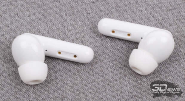 На цилиндрической части корпуса с разных сторон можно заметить по три отверстия, за которыми скрываются микрофоны. На внешней стороне расположены сенсорные площадки, ну а изнутри, на не совсем привычном месте, находятся контактные площадки для подзарядки встроенного аккумулятора от футляра. Необычное расположение площадок связано с форм-фактором футляра, с которым мы также скоро познакомимся.