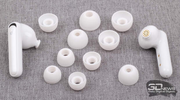 Выводные трубки у наушников имеют круглую форму, а силиконовые вкладыши взаимозаменяемы с любыми другими. Никаких хитростей в их конструкции не замечено, а возможность замены амбушюров была подтверждена живым примером: подошли вкладыши от первых попавшихся под руку наушников подобной конструкции.