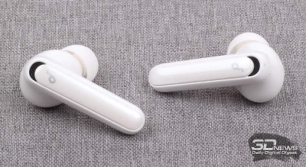 Компоновка для Soundcore Life Note 3 NC выбрана классическая. Овальное тело из лакированного гладкого пластика плавно переходит во внешнюю цилиндрическую часть с одной стороны и выводную трубку, закрытую золотистой металлической сеточкой, с другой. Самое главное, что наушники немного меньше аналогов, а потому в ушах не будут смотреться неким чужеродным предметом, как это порой бывает с TWS-моделями.