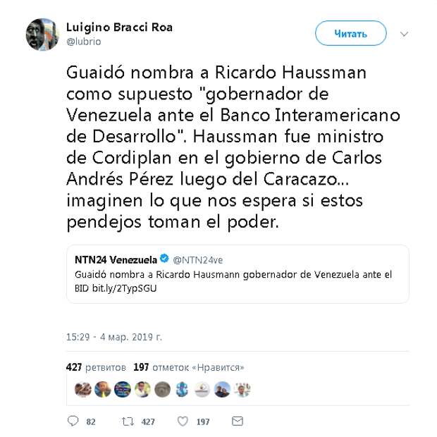 "Гуайдо назвал Рикардо Хауссмана "губернатором Венесуэлы при Межамериканском банке развития". Хауссман был министром Кордиплана в правительстве Карлоса Андреса Переса после Караказо... представьте, что нас ждет, если эти придурки захватят власть."- с ужасом пишет о "назначении" Гуайдо лауреат венесуэльской Национальной премии в области журналистики 2016 в секторе цифровой журналистики Луиджино Браччи Роа.