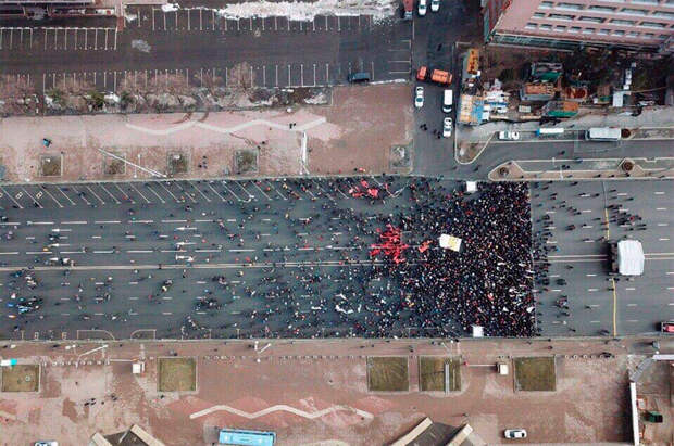 По данным полиции, на митинг собрались 6,5 тыс. человек, в «Белом счетчике» насчитали 15,3 тыс. Как мы видим на фотографии, снятой с дрона, ошибаются и те, и другие. Сотни три-четыре, не больше. Ну, может, пять, если подтянулись те, что неприкаянно бродят по площади.
