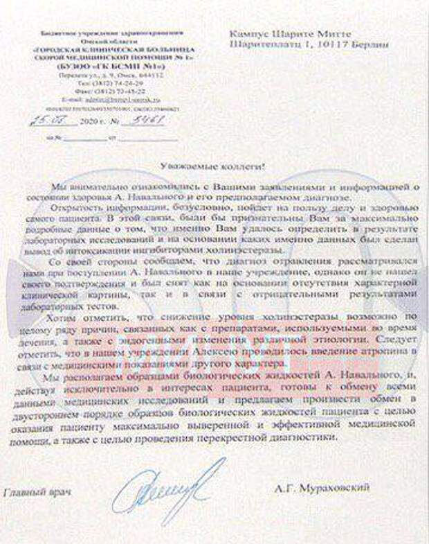 Отдельное обращение в «Шарите» отправил и главный врач первой больницы скорой помощи Омска Александр Мураховский, попросив предоставить данные исследований, на основании которых немецкие медики определили интоксикацию ингибиторами холинэстеразы.