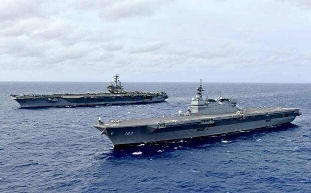 Эскадренный миноносец-вертолётоносец типа «Идзумо» ВМС Японии на переднем плане и авианосец ВМС США на заднем