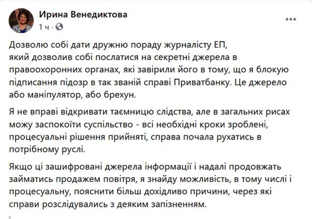 Так отреагировала на обвинения генеральный прокурор Ирина Венедиктова на своей странице в Facebook.