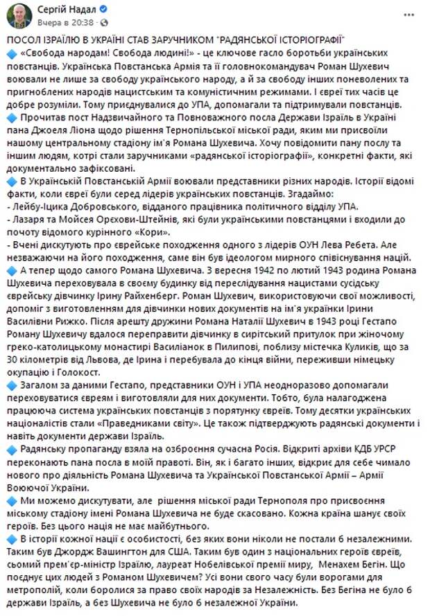 «Поэтому десятки украинских националистов стали "Праведниками мира". Это также подтверждают советские документы и даже документы государства Израиль», — оправдывает националистов тернопольский градоначальник.