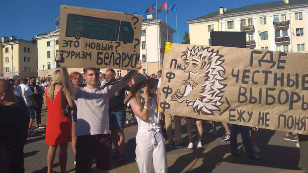 Людей на площади становится больше и больше. Растягивают стометровый бело-красно-белый флаг. Снизу его поддерживает множество людей, когда устает один, на смену становится другой. Многие держат в руках плакаты, обыгрывающие характеристики, которые давал манифестантам Александр Лукашенко, например: «Я приехал от Навального. Куда идти?» и «Овечек много — баран один». Были замечены и такие: «Честный учитель за честную Беларусь», «Диалог после трибунала»… Собравшиеся ждут появления мэра города Александра Рогачука: в своем официальном Telegram-канале он пообещал быть на площади в 16:00.