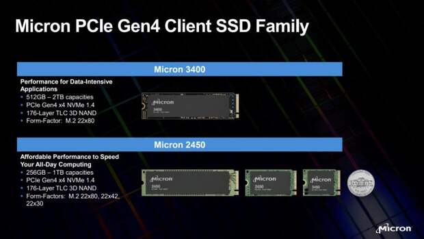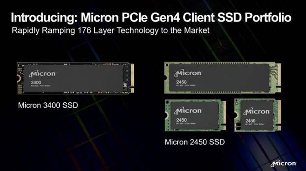 Компания Micron представила новые серии твердотельных NVMe-накопителей, которые построены с использованием 176-слойных чипов флеш-памяти TLC 3D NAND. Серия Micron 3400 представлена высокоскоростными моделями в форм-факторе M.2 2280. Серия Micron 2450 в свою очередь состоит из более доступных решений в полноразмерном форм-факторе M.